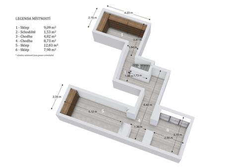 sklep - 9,09 m², schodiště - 1,53 m², chodba - 4,82 m², chodba - 8,73 m², sklep - 12,03 m², sklep - 7,90 m².