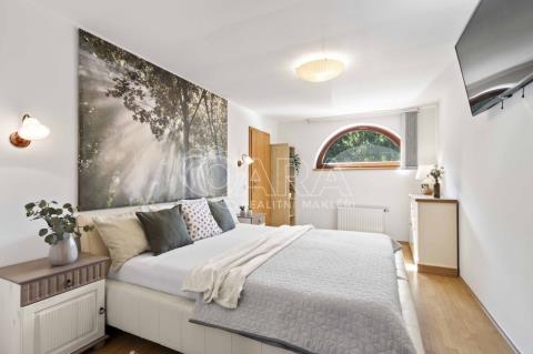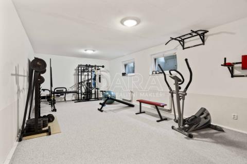 Uvnitř vás čeká pět samostatných a prostorných ložnic, více než šedesátimetrový obývací pokoj, rozdělený na klidovou a společenskou zónu s kulečníkovým stolem a krbem a v suterénu najdete ještě i fitness a společenskou místnost, kde se potkává rodina i přátelé.