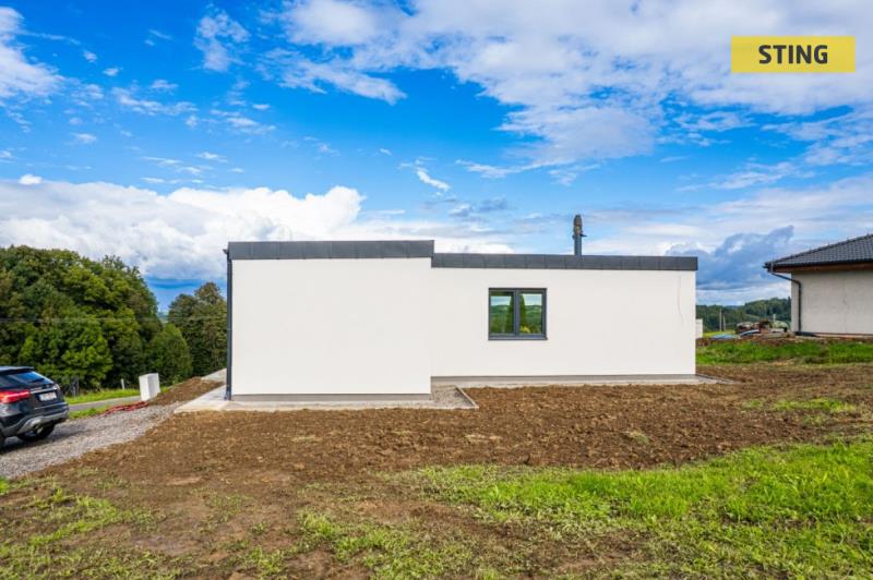 Máme pro vás nabídku novostavby rodinného domu v klidné části Těrlicka, v lokalitě Hradiště pod Babí horou. Jedná se o přízemní dřevostavbu 3+kk ve tvaru písmene „T“, na pozemku o celkové výměře 1.100 m2. Zastavěná plocha rodinného domu včetně terasy činí 105 m² .