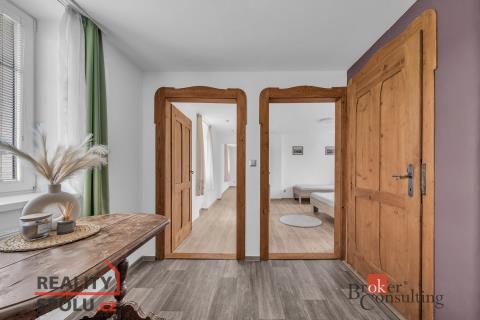 Koupě rodinného domu je vždy začátkem nové kapitoly života. A pokud má být náš životní příběh zajímavý, chceme něco nevšedního, kdy je na první pohled jasné, že se jedná vskutku o originál. Pokud tedy nenacházíte nadšení v domech s klasickou šikmou střechou či moderních kostkách, mám tu pro vás něco jedinečného. A navíc ve skvělé lokalitě. Tento podsklepený dvoupodlažní dům s celkovou plochou pozemku přes 1 200 m2 v Trutnově, v městské části Kryblice, vás okouzlí svým dobovým rázem, který podtrhuje zrekonstruovaná mansardová střecha. A když jsme u těch rekonstrukcí, tak těch zde proběhlo požehnaně. Rekonstrukce do obyvatelného stavu probíhala v letech 2013 až 2014 a vyjma nosných konstrukcí domu, zahrnovala výměnu takřka všeho. Proběhla zde hydroizolace obvodového zdiva, sklepa i podlah v přízemí. Dále výměna omítek, podlahových krytin, oken, některých prvků střešní konstrukce a samotné střešní krytiny. Nejednalo by se samozřejmě o poctivou rekonstrukci, pokud by se zde neudělaly i nové rozvody elektřiny, vody, odpadů a topení - s tím vším zde můžete počítat. V následujících letech byla přistavěna další část domu ve 2. nadzemním podlaží s výhledem do zahrady, jak můžete poznat z fotografií exteriéru dle barvy střešní krytiny, a montáž zateplené fasády - třída průkazu energetické náročnosti (PENB) je zde A - Mimořádně úsporná. V poslední řadě byl před dvěma lety zhotoven plot a zámková dlažba, pod kterou je ukryta retenční nádrž o objemu 4 m3 pro sběr užitkové vody. K parkování vám zde skvěle poslouží prostorná zámková dlažba před domem, či už jen dvě vlastní parkovací stání pod domem. Čeká vás tak moderní bydlení se zachovaným geniem loci. Na Kryblici jste daleko od klasického městského ruchu, a zároveň blízko všemu potřebnému. Do centra města je to 1 kilometr a vše tak potřebné máte na dosah. Navíc se jedná o zelení příjemně doplněnou lokalitu, kde se dobře žije. Sama ulice Alšova je velmi klidná vedlejší ulička směřující jen a pouze do rezidenční části několika domů. Možná je právě toto vaše nová životní kapitola. To se však dozvíte jen a pouze na osobní prohlídce. Tak na viděnou na Kryblici!