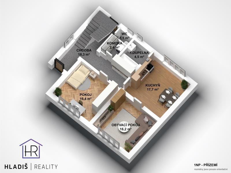 - dispozice 4+1 – možnost rozšíření na 6+1 skrz podkroví v 2. nadzemním podlaží