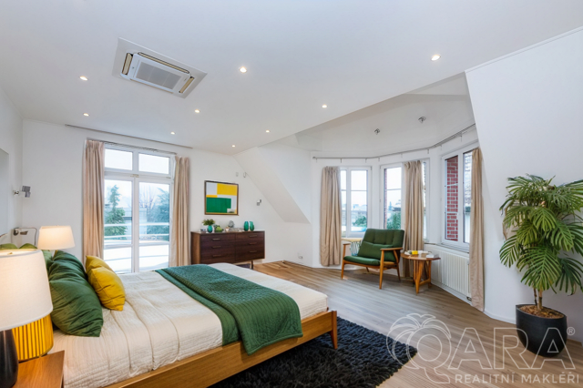 - Druhá ložnice (20,5 m²) se samostatnou koupelnou a šatnou, přímý vstup na balkon
