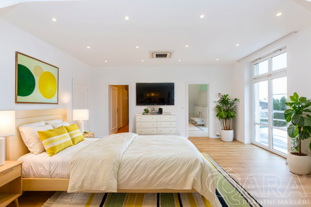 - Hlavní ložnice (30,9 m²) se samostatnou koupelnou a šatnou