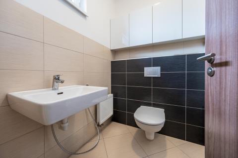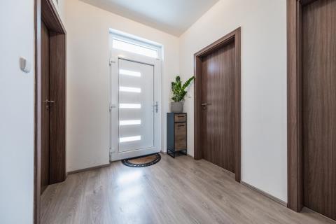 Nemovitost sestává ze dvou podlaží, v přízemí se nachází obývací pokoj s kuchyňským koutem o velikost 40 m2, WC 2,1 m2, šatna 5,1 m2, technická místnost 3 m2 a komora 2 m2, zádveří 5,4 m2, dále přímý vstup na terasu a zahradu o velikosti 61 m2 z obývacího pokoje. V 1.patře jsou 3 ložnice 15,6 m2, 10,7 m2, 13,7 m2, šatna 5,1 m2 ( pracovna ), koupelna s WC 6,4 m2 a chodba 3,1 m2 Dům je zabezpečen alarmem. Ve všech oknech jsou bezpečnostní fólie. Na zahradě je instalován zavlažovací systém.