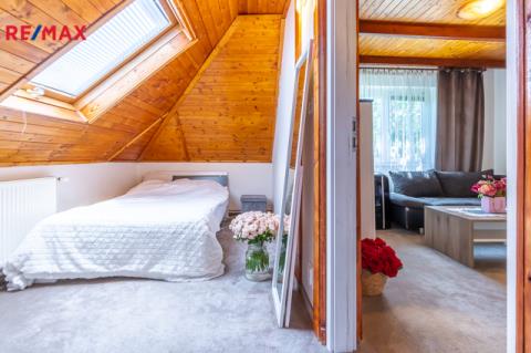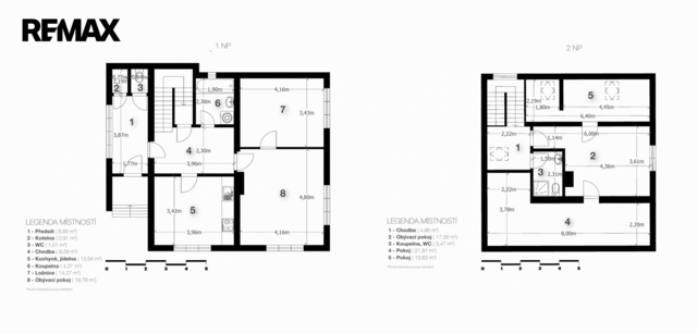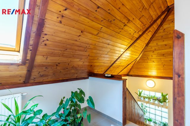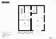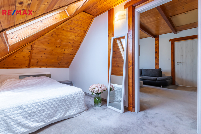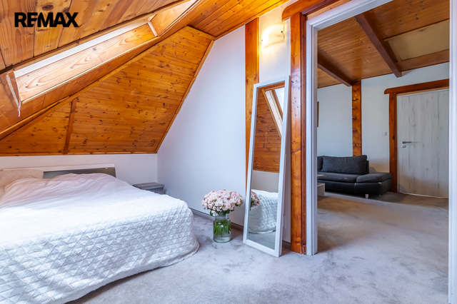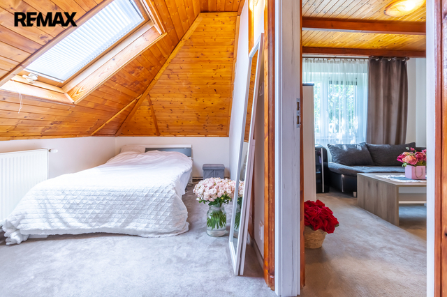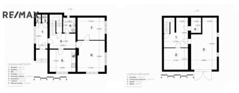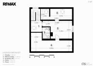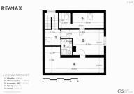 • 1. patro: obývací pokoj (17,26 m²) s navazujícím vstupem do dvou neprůchozích podkrovních pokojů (13,36 m² a 21,91 m²) a koupelna se sprchovým koutem a toaletou (3,47 m²).