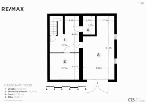 • Suterén: garáž (27,85 m²), dvě další místnosti (12,92 m² a 12,57 m²) a technická místnost (3,69 m²).