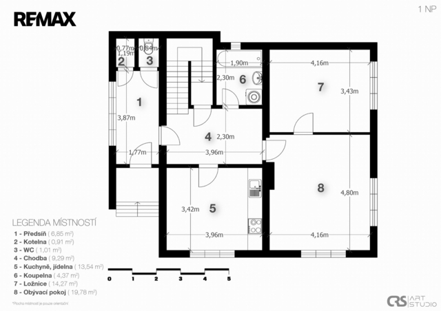 • Přízemí: předsíň (6,85 m²), chodba (9,29 m²), prostorná kuchyně s jídelnou (13,54 m²), obývací pokoj (19,78 m²), neprůchozí pokoj (14,27 m²), koupelna s vanou (4,37 m²), toaleta (1,01 m2), kotelna (0,91 m2).