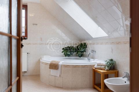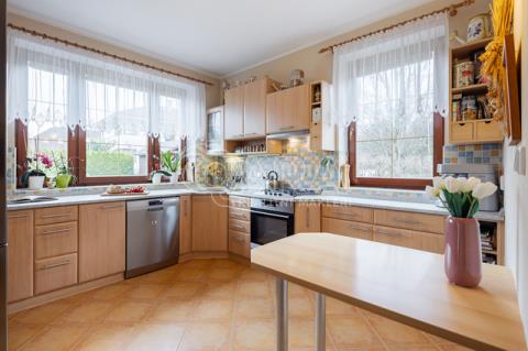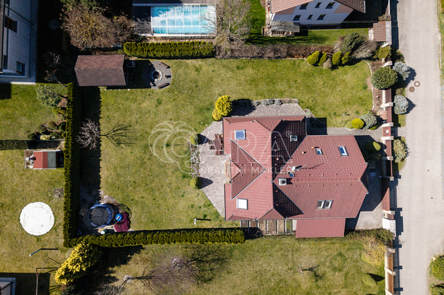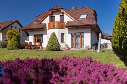 Dům z roku 2004 je dispozičně řešen jako 6+1 s garáží a je ve velmi dobrém stavu. Přízemí využíváno jako společenská zóna: obývací pokoj s krbem a navazující terasou, samostatná kuchyně s komorou, pracovna, hala se schodištěm, koupelna se sprchovým koutem a samostatné WC. V patře se nachází čistě soukromá část, kterou tvoří 4x ložnice (tři ložnice mají vstup na balkon), hlavní koupelna s vanou, sprchovým koutem a s WC, chodba a menší koupelna se sprchovým koutem a s WC. Posledním prostorem v domě je půda (úložný prostor pro lyže, kufry, sportovní vybavení a sezonní potřeby pro celou rodinu).