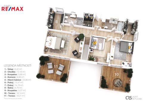 - 3 terasy o celkové výměře 50 m²,