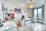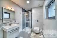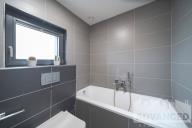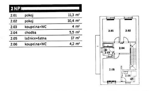 V horním patře se nachází hlavní ložnice s šatnou (17 m2) a svou koupelnou (4.2 m2, sprchový kout, umyvadlo a WC), 2 ložnice (11.3 a 10.4 m2) a koupelna s vanou, umyvadlem a WC (4 m2).