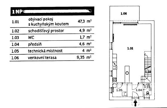 V přízemí se nachází předsíň s vestavěnou skříní (4.6 m2), prostorný světlý obývací pokoj s kuchyňským koutem (52.2 m2) a vstupem na terasu (9.35 m2), z které je vstup menším schodištěm na vlastní zahrádku (56.8 m2). Kuchyně zn. Gorenje je plně vybavena (indukční deska, myčka, vestavěná trouba, mikrovlnka a lednice s mrazákem) a má úžasně velký pracovní ostrůvek. U kuchyně je technická místnost (4 m2), kde je připojení na pračku/sušičku, plynový kotel (ohřev teplé vody a topení) a praktický úložný prostor. Dále je na tomto patře samostatné WC s umývátkem (1.7 m2).