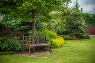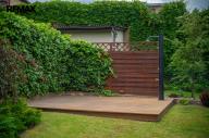 Vzrostlá zahrada s posezením a dřevěnou kůlnou. Příprava na automatické zavlažování.