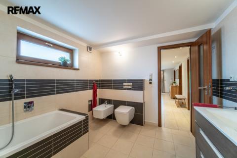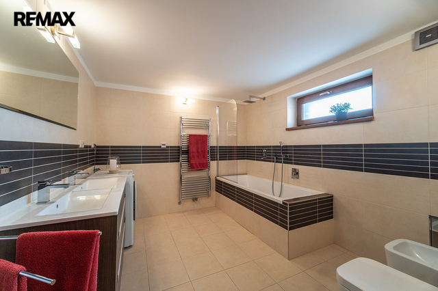 Koupelna s vanou, dvěma umyvadly, toaletou a bidetem (7,39 m2)
