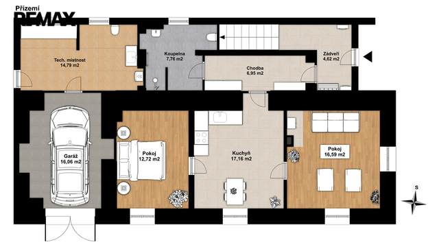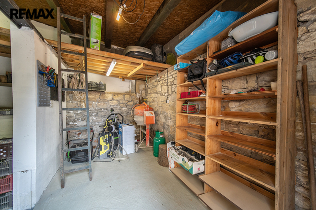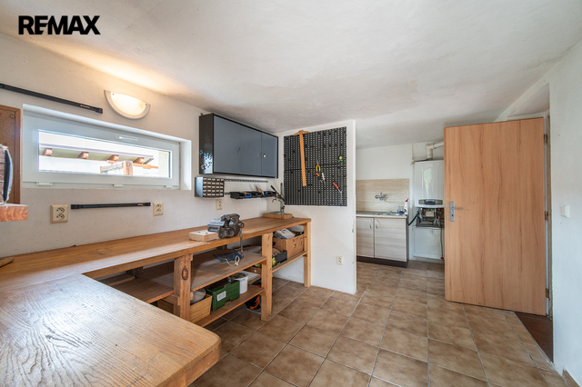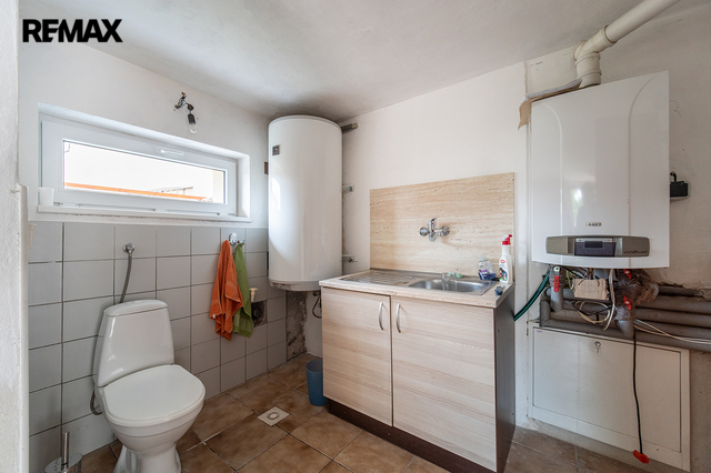 Technická místnost (14,79 m2) s toaletou přístupná z garáže a zahrady - lze využít i jako letní kuchyň.