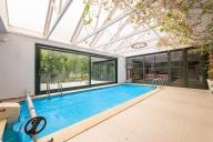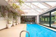 Rodinný dům: obytná veranda (24,5 m²), kuchyně s jídelnou (25,5 m²), obývací pokoj (28,5 m²), společenská místnost (24,5 m²), bazénová hala (45,0 m²), chodba (2,5 m²), koupelna s WC (15,0 m²), ložnice (21,0 m²), ložnice (20,0 m²), chodba (3,4 m²), koupelna s WC (2,5 m²), komora (3,0 m²)