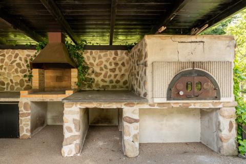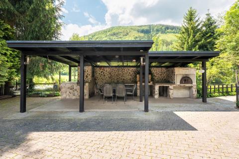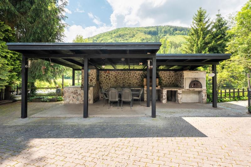 Hlavní dům disponuje třemi pokoji, kuchyní, společenskou místností a bazénovou halou. Je zde také možnost rozšíření o půdní vestavbu. Dále se na pozemku se nacházejí dva hostinské domy. První dům má dispozici 2+kk s vlastním sociálním zařízením, dílnou a černou kuchyní/přípravnou. Druhý nabízí dva pokoje a koupelnu s WC. Další vybavení zahrnuje stylové kryté posezení s krbem, grilem a udírnou. Samozřejmostí je kryté parkovací stání pro více aut a dále skleník.