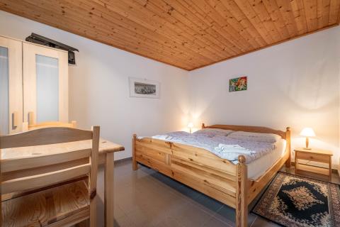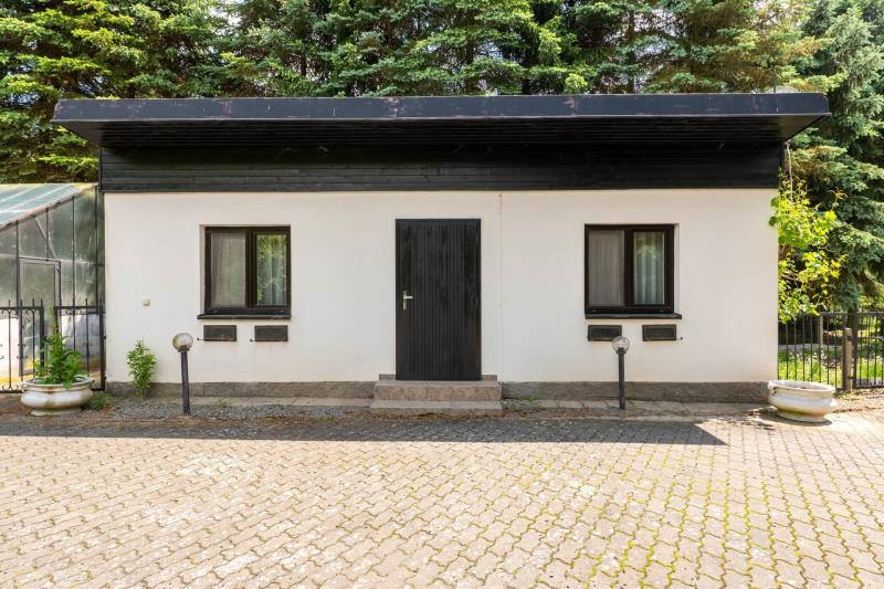 Dům pro hosty: chodba (1,8 m²), pokoj (13,6 m²) s kuchyňským koutem (6,6 m²), pokoj (6,5 m²), koupelna s WC (2,7 m²), dílna (22,5 m²), černá kuchyně (10,5 m²)