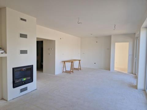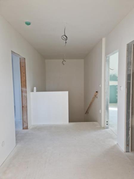finální povrch podlah (nyní broušený anhydrid), obklady, sanita (vana, umyvadlo, WC), parapety, zárubně, interiérové dveře.
