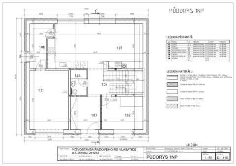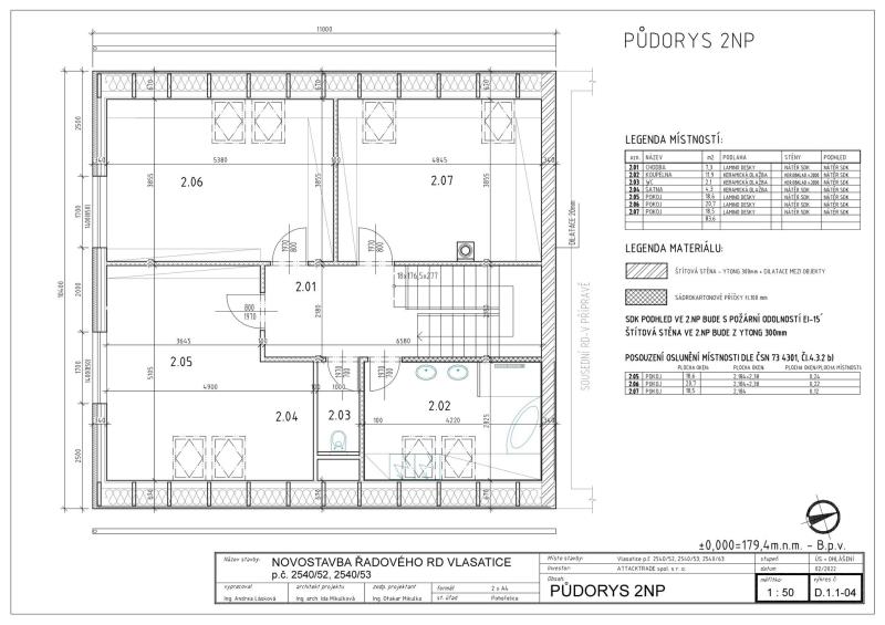 1.patro (83,6 m2): chodba 7,3 m2, koupelna 11,9 m2 – připraveno na: vanu, sprchovým kout (box), 2 umyvadla, vývod na pračku a sušičku, samostatné WC s umyvadlem 2,1 m2, 2x pokoj 23 m2, 20,7 m2 se střešními okny a klasickým oknem ve štítové zdi a 1x pokoj 18,5 m2 pouze se střešními okny.