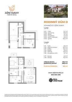1.NP: hala (8,5 m²), obývací pokoj s kuchyňským koutem (32,3 m²) a vstupem na terasu (15,3 m²), pokoj (15,4 m²), pokoj (11,6 m²), ložnice (19,3 m²) s terasou (4,3 m²), koupelna s WC (5,7 m²)