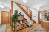 Přízemí - zádveří, WC, hala s botníkem a schodištěm do 1.patra, obývací pokoj s jídelnou a kuchyňským kouterm, ložnice, komora, koupelna s vanou i sprchovým koutem, WC a bidetem, spojovací úložná místnost do garáže pro dva automobily, jejíž součástí je také technická místnost a dílna se vstupem na zahradu.