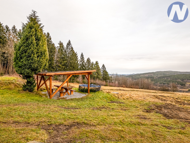 Nabízím ke koupi dům na Šumavě s 2 bytovými jednotkami (235 m2) na pozemku o rozloze 12.385 m2, v obci Zdíkov, části Račov, 9 km od skiarálu Zadov. Dům se nachází v nadmořské výšce 745 m n.m., uprostřed luk a lesů, s krásným výhledem do šumavské krajiny. Nabízený dvoupodlažní rodinný dům o zastavěné ploše 219 m2 slouží momentálně jako velmi vyhledávané rekreační ubytovací zařízení s kapacitou ubytování 16 osob. V zaběhlém pronajímání je možné pokračovat, správa zajištěna. Každé patro má svůj vchod a terasu. V přízemí je byt o velikosti 3+kk (76 m2) a v patře 5+kk (136 m2) + terasa (23 m2). V domě je také garáž (28 m2).Vytápění objektu včetně vody je řešeno tepleným čerpadlem umístěným ve vrtu. Na zahradě se nachází přístřešek s posezením, terasa a parkovací stání pro 4 vozidla. Doporučuji prohlídku. Více informací u makléřky.