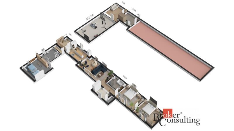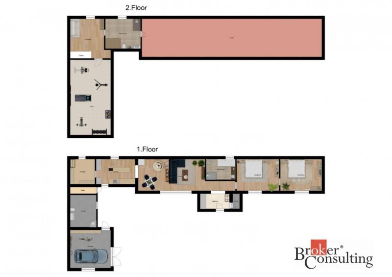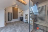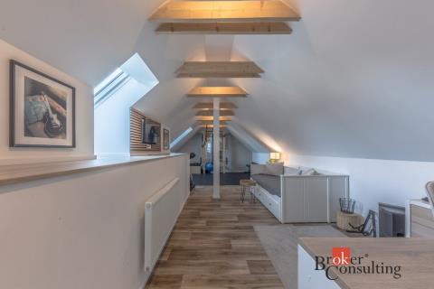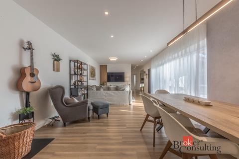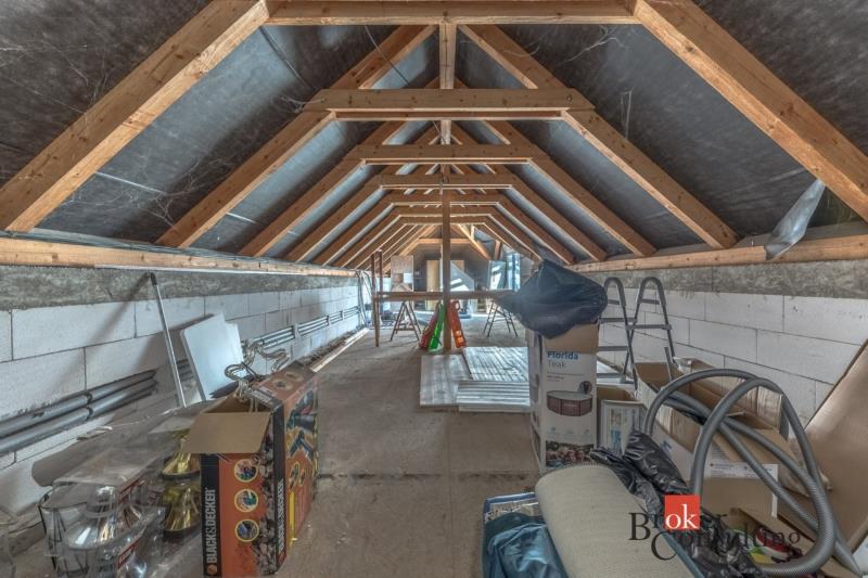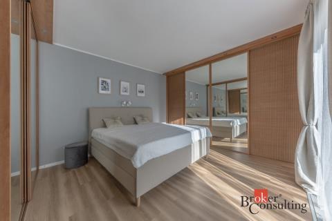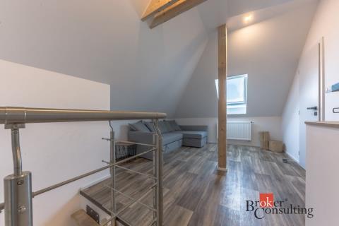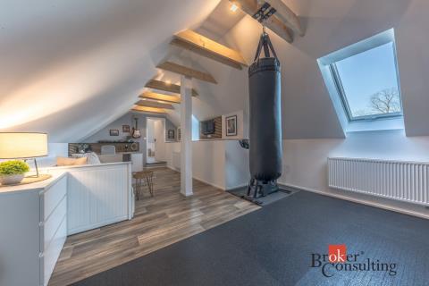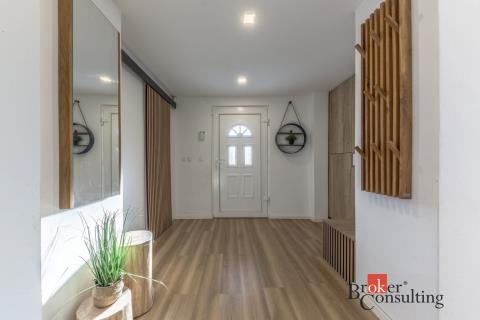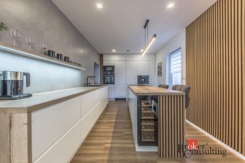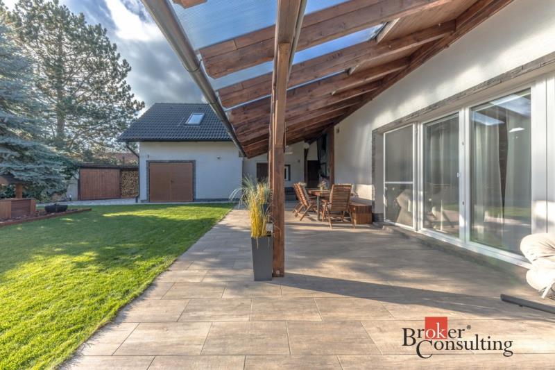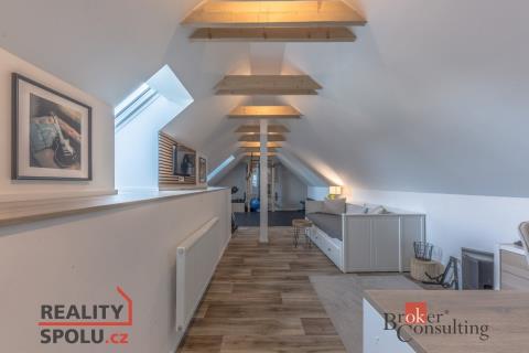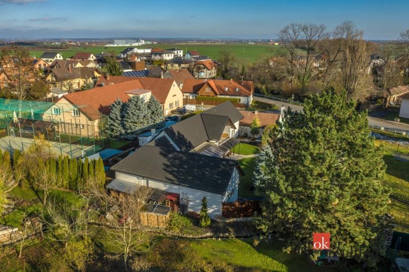 Dispozice domu: na přízemí se nachází vstupní hala, koupelna s vanou, sprchovým koutem, toaletou s umyvadlem, dvěma ložnicemi, kde každá disponuje prostornou vestavnou šatní skříní. Světlý obývací pokoj s jídelnou je útulný i díky krbovým kamnům, navazující kuchyň umožňuje propojení s obývacím pokojem, je zde i prostorný špajz. Z kuchyně je přímý vstup na terásku za domem, kde lze ráno ráno posnídat. Hlavní venkovní sezení je situované u obývacího pokoje v zahradě. Samostatně přístupná technická místnost, která slouží i jako prádelna, s pračkou a se sušičkou je hned vedle garáže (22 m2). Do patra se dostaneme po točitých schodech, tuto část majitelé využívají pro relaxaci. Najdeme zde velkou koupelnu s toaletou, se sprchovým koutem, saunou, odpočívárnu a prostornou pracovnu s fitness koutem.