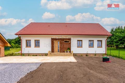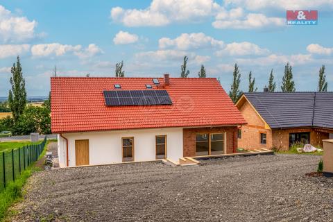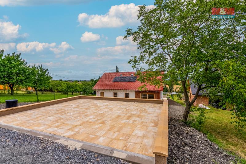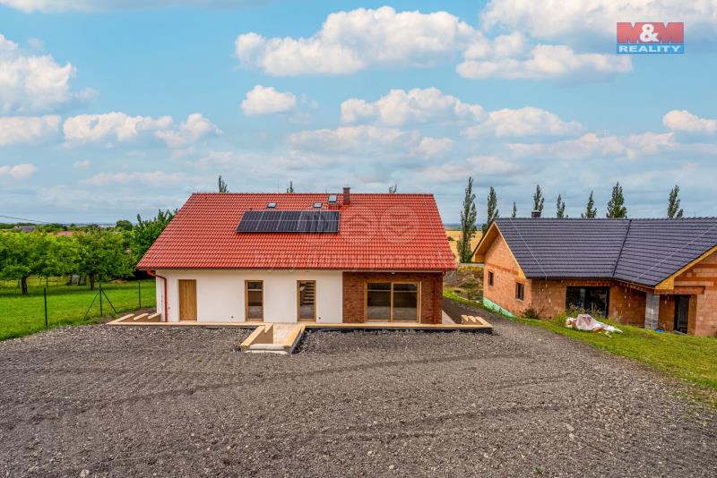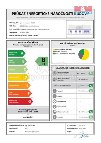 Nabízíme k prodeji moderní novostavbu rodinného domu 5+kk na oploceném pozemku o velikosti 1 613 m² v obci Vlkov pod Oškobrhem. Výborná dopravní dostupnost: 30 min Praha, 7 min Poděbrady, 35 min Hradec Králové. Dům je dokončen a připraven k nastěhování. Postaven z kvalitních materiálů – Porfix 30 cm + 15 cm zateplení, střešní krytina Bramac, plastová okna s trojsklem. Vytápění a ohřev vody zajišťuje tepelné čerpadlo vzduch–voda PROTHERM GeniaAir s výkonem 7 kW a zásobníkem 250 l. Na střeše jsou 4 fotovoltaické panely (450 Wp). Energetická třída B – velmi úsporná, zajišťuje velmi nízké náklady na bydlení. V obývacím pokoji je dále krbová vložka Hoxter. Dům je napojen na kanalizaci i vodovod. Dešťová voda se zachytává do jímky (6 m³) pro zálivku zahrady. Na dům navazuje terasa (vstup ze tří pokojů), k dispozici je parkovací stání pro 2 auta, vjezd z obou stran pozemku. Bez právních vad, lze financovat hypotečním úvěrem. Pro více informací či prohlídku mě neváhejte kontaktovat.
