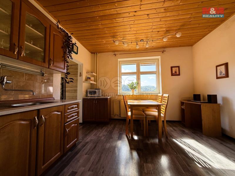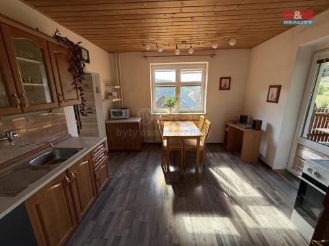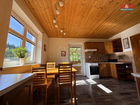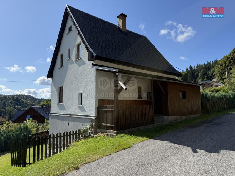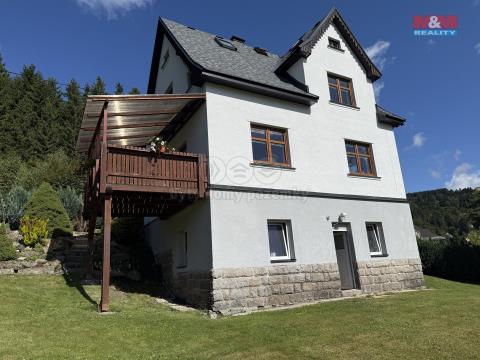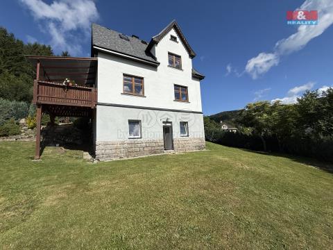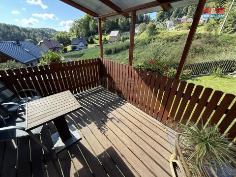 Nabízíme ke koupi rodinný dům se zahradou, k.ú. Hraničná nad Nisou v Jizerských horách. Vstup do domu zádveřím s úložným prostorem. Velká chodba se schodištěm zajištuje vstupy do přízemí, 1.NP a suterénu. V přízemí kuchyně s jídelní částí a vstupem na prosluněnou terasu. Obývací pokoj s krbovými kamny. Koupelna s vanou, sprchovým koutem a umyvadlem. Toaleta samostatná. V 1.NP dva pokoje a komory. Podkroví rozdělené na další dva pokojíčky. V suterénu domu kotelna a dílna. Okna plastová, podlahy plovoucí a keramická dlažba, vytápění zajištěno kotlem na dřevo a krbovými kamny, ohřev vody bojler. Na pozemku vlastní kopaná studna, odpady - žumpa. Dům s nádherným výhledem do okolí, zahrada udržovaná. Možnost odkoupení garáže naproti domu. Veškerá občanská vybavenost v místě. Nenechte si ujít tuto jedinečnou příležitost, těšíme se na vás na prohlídkách.