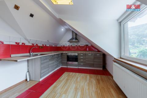 Prodej domu v lázeňském městě Jáchymov. Dům z r.1945 je ideální volbou pro bydlení, investici, nebo k rekreaci ve vyhledávané lokalitě Krušných hor. V domě se nachází 4 samostatné BJ. Byt v 1.NP 2+1 obývá platící nájemník. Byt ve 2.NP 2+1 se zimní zahradou, interiér vyžaduje rekonstrukci. Podkrovní byt ve 3.NP 1+kk s venkovní terasou k okamžitému nastěhování, nebo k pronájmu. Na domě byla realizována částečná rekonstrukce a vytvořena další bytová jednotka ve 2.NP - garsoniéra o velikosti cca 24m2, ve stavu před dokončením. V suterénu je dílna a sklepní prostory. K domu náleží zahrádka s pergolou o rozloze 108m² ve svahu. Svah je zpevněn nově vystavěnou opěrnou zdí. Ze vstupní haly se vchází na zahradu i do jednotlivých pater domu. Vytápění kotlem na TP-kotel nesplňuje emisní třídu dle zák.na ochranu ovzduší vyd. 1.9.2024, revize kotle je platná do 6/2026. Pokud Vás tato nabídka zaujala, pro více informací a domluvení termínu prohlídky kontaktujte makléře, pomůže vám i s financováním.