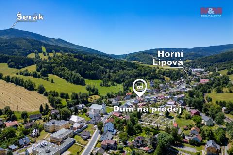 Užijte si klid a krásu podhůří Jeseníků v obci Lipová-lázně – ideálním místě pro celoroční rekreaci, trvalé bydlení i investici. Nabízíme k prodeji rodinný dům o dispozici 5+1 s prostornou zahradou. Užitná plocha domu činí 190 m², celková plocha pozemku je 1 442 m². Dispozice: V 1. NP se nachází obývací pokoj, ložnice, kuchyně, koupelna se sprchovým koutem a toaletou, samostatné WC, spíž s přístupem do sklepa se skladem uhlí a prostorná chodba, ze které je přímý vstup na verandu a dále na zahradu. Po dřevěném schodišti se dostanete do 2. NP, kde jsou další tři ložnice, chodba a půda. Za domem je oplocená, rovinatá zahrada s pergolou, posezením, grilem, ohništěm, kůlnou a vzrostlými stromy. Ze zahrady (i z přední části domu) je vstup do čtyř původních hospodářských místností, využitelných jako garáž, dílna, klubovna nebo domácí wellness. Dům je napojen na vodovod, kanalizaci, plyn a elektřinu. Vytápění zajišťuje plyn. kotel, v obývacím pokoji je krb, ohřev vody zajišťuje el. bojler.