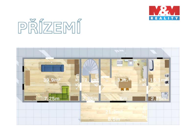 Nabízíme k prodeji kouzelný rodinný dům v klidné části obce Kladruby nad Labem, místní části Kolesa. Tento dvoupodlažní dům po rekonstrukci o dispozici 5+1 je ideální volbou pro ty, kteří hledají klidné bydlení v krásné krajině. V přízemí se nachází velký obývací pokoj, prostorná kuchyně se spižírnou a jídelním koutem, koupelna s WC, bidetem a komora. Z jídelny vedou francouzská okna na zastřešenou terasu na SV, zatímco z obývacího pokoje je přístup na zahradu na JZ. V prvním patře jsou čtyři oddělené pokoje, WC a velká chodba. Dům je vytápěn plynovým kotlem s podlahovým topením v přízemí a radiátory v patře. K domu patří rozlehlá zahrada s předzahrádkou, terasa a přístavba skladu/dřevníku. Celková plocha pozemku je 1525 m², užitná plocha domu činí 200 m². Připojení na elektřinu, vodovod, vlastní studna a septik zajišťují komfortní bydlení s dobrou dostupností do Prahy, Kolína, Pardubic a Hradce Králové. PENB se zpracovává.