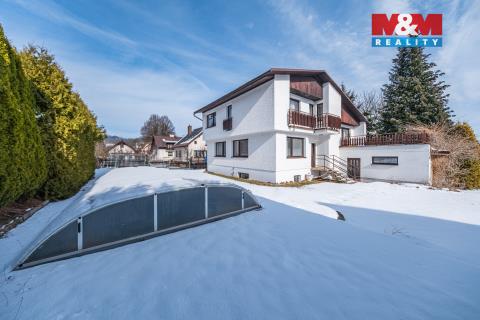 Prodej prostorného rodinného domu v klidné části Horní Branné, ideální poloha u hor. Cihlový samostatný dům o užitné ploše 300 m² (5 podlaží včetně suterénu), 11 místností, balkon, členité dispozice se samostatnými ložnicemi, koupelnami a společenskou místností. Pozemek 1 340 m², venkovní krytý bazén, garáž pro 4-5 auta. Využití jako prostorný rodinný dům nebo penzion. Stav velmi dobrý. Prohlídky po domluvě.
