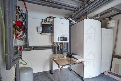 Vytápění domu, bazénu i příprava TUV pomocí špičkového švédského tepelného čerpadla zn. IVT (17 kw), pro bazén ve sklepě výměník. Bivalentním zdrojem je kombinovaný plynový kotel Protherm a pro ohřev TUV el. bojler o objemu 200 l. V prvním podzemním podlaží se nachází 300 l bojler na teplou a užitkovou vodu, druhý na vodu topnou. Elektřina 220/380 V, 2 samostatné plynoměry pro byt v 1. NP a 2. NP. V domě zaveden podružný vodoměr pro zahradu - možnost odpočtu stočného na zálivku a bazén. Energetická náročnost budovy byla stanovena na klasifikační třídu D, a to díky zahrnutí spotřeby za celoroční vytápění bazénu a nemalou spotřebu při pravidelném využívání sauny, reálné náklady na provoz samotné nemovitosti tak díky skvělé izolaci odpovídají spíše vyšší třídě (viz např. reálně ověřitelná stálá teplota kolem 16°C v nevytápěných prostorách 1.PP).