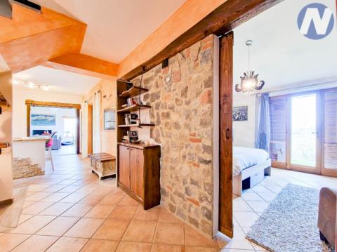 Vstupní část v přízemí vás přivítá útulným obývacím pokojem. Srdcem domova je zděná jídelna s centrálním ostrovem, jejíž okna rámují výhled na venkovní terasu. V přízemí je ještě další velký obývací pokoj s krbem a prostorná ložnice s francouzským oknem, vlastní elegantní koupelnou a přilehlou místností využívanou jako šatna.