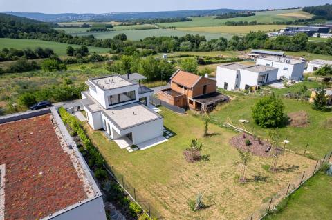 Novostavba vily je citlivě umístěna v mírně svažitém terénu pozemku s překrásnými panoramatickými výhledy do okolní krajiny.