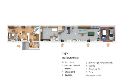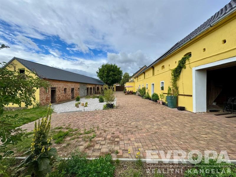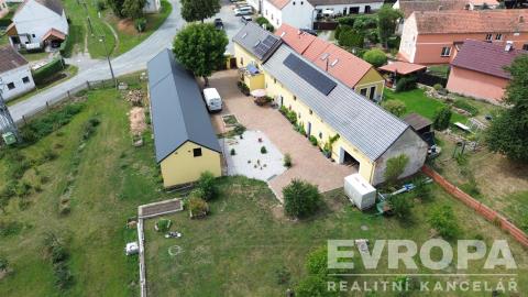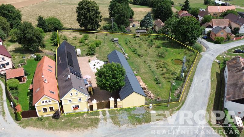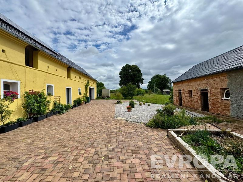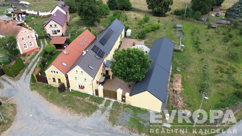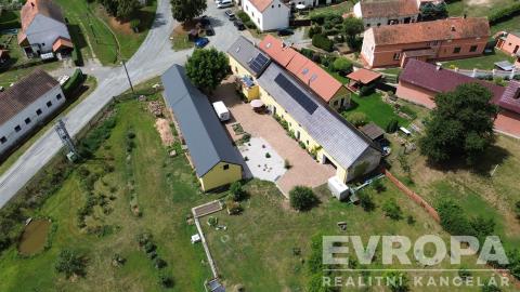 Nabízíme kompletně zrekonstruovanou bývalou zemědělskou usedlost na pozemku o celkové rozloze 4.765m2 v obci Lisov nedaleko Hradce u Stoda. Nemovitost prošla kompletní rekonstrukcí veškerých rozvodů, omítek, podlah, fasády, nové střechy atd. Je zde využita moderní technologie na provoz jako je tepelné čerpadlo a solární panely včetně baterií. Ohřev TUV zajišťuje boiler pomocí solární energie. Nemovitost se skládá z rodinného domu o dispozici 3+kk ve dvou nadzemních podlaží o užitné ploše 110m2. Na rodinný dům navazuje stodola po kompletní rekonstrukci kde nalezneme velkorysou kuchyň 26m2 s koupelnou 4m2, společenskou místnost 70m2 a garáž 40m2. Podkroví stodoly je možné rozšířit o další obytnou část. Na druhé straně nádvoří se nachází nově vybudovaná otevřená pergola 65m2 a různé sklady, dílny, prostory pro chov zvířat s potenciálem na vytvoření dalších obytných prostor. Z inženýrských sítí je nemovitost napojena na elektřinu a obecní kanalizaci. Voda je do domů zavedena z 50m hlubokého vrtu, druhá kopaná studna je využívána na zalévání zahrady. Vytápění rodinného domu je pomocí tepelného čerpadla a koupelny s kuchyní ve stodole jsou vybaveny elektrickým podlahovým topením. Stodolu vytápí kamna na tuhá paliva. Průkaz energetické náročnosti budovy zatím nebyl vypracován, proto je v inzerátu uvedená energetická třída G. Na pozemku s jižní orientací dále nalezneme ovocný sad a rybník do kterého je sváděna veškerá dešťová voda. Jedinečná nabídka bez potřeby dalších investic vhodná k veliké škále využití jak na bydlení, podnikání, hospodaření atd. Doporučuji, zamilujete se.