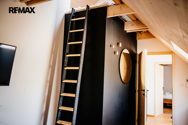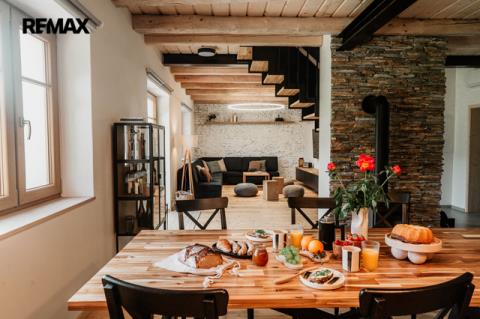 Pro navození pohodové atmosféry, a jako záložní zdroj, vytápění má nemovitost krbová kamna. Velmi pěkně vypadá designové schodiště na míru, které dotváří a podtrhuje celý funkční celek.