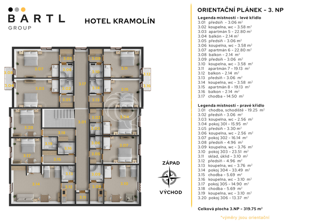 Samotná budova disponuje více než 1 200 m² užitné plochy a je rozdělena do tří podlaží. K dispozici je celkem 17 pokojů, včetně prostorných rodinných apartmánů, s celkovou kapacitou 74 lůžek. Nad rámec této kapacity jsou součástí hotelu také prostory pro personál a místnosti využívané majitelem pro vlastní potřebu. Zázemí doplňuje restaurace pro 80 hostů a samostatný salonek pro 50 osob. Hotel je tak připraven nabídnout komfort nejen rodinám, ale také školám, sportovním skupinám nebo firemní klientele.