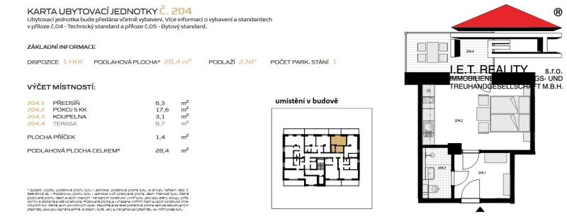 V apartmánu najdeme předsíň, pokoj s kuchýňským koutem za kterého se vcychází na terasu a koupelnu s toaletou a sprchovým koutem. Před budovou bude velká parkovací plocha s prvky zeleně a s 6 dobíjecími stanicemi pro elektromobily.