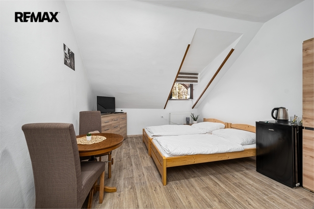 Prodej penzionu Volary – zavedené ubytování v srdci Šumavy V historické části města Volary nabízíme k prodeji zrekonstruovaný dům, který je ideálně připraven pro provoz penzionu nebo rodinného ubytování. Nemovitost se nachází v oblíbené turistické lokalitě Šumavy s celoroční návštěvností – v létě turistika, cyklostezky a příroda Národního parku Šumava, v zimě běžkařské trasy a lyžařské areály. Dům je v současnosti dispozičně řešen tak, aby pohodlně fungoval jako menší rodinný penzion s dostatečným zázemím pro hosty i provozovatele. Dispozice domu Po vstupu do domu se nachází zádveří, které vede do velké společenské místnosti s barem – ideální prostor pro snídaně, večerní posezení hostů nebo menší společenské akce. Z levé strany společenské místnosti je vstup do chodby, kde se nachází kuchyně, ložnice a další společná kuchyně určená pro ubytované hosty. Na konci společenské místnosti je přímý vstup na zahradu, kde hosté ocení venkovní posezení zejména během letních měsíců. Součástí prostoru jsou také točité schody do patra. V patře se nachází velký pokoj pro čtyři osoby a dále chodba, ze které je vstup do dalších pěti pokojů. Některé z pokojů jsou řešeny jako patrové, což zvyšuje ubytovací kapacitu penzionu a nabízí flexibilitu pro rodiny i skupiny hostů. Zázemí pro hosty Na zahradě je k dispozici venkovní bazén a prostorná pergola s grilem, které jsou mezi hosty velmi oblíbené zejména v letní sezóně. Parkování je možné přímo před domem, což je v historické části města velká výhoda. Hlavní výhody nemovitosti vyhledávaná turistická lokalita Šumava – celoroční provoz dispozice byt + pokoje na ubytování vhodné pro penzion dům po rekonstrukci velmi dobré hodnocení 8,5 na portálu Booking společenská místnost s barem zahrada s bazénem a pergolou parkování před domem možnost dalšího rozvoje služeb (např. restaurace nebo rozšíření gastronomie) Dům je napojen na plynovou přípojku, vytápění zajišťuje kondenzační plynový kotel s nízkými provozními náklady. Nemovitost představuje zajímavou příležitost pro zájemce, kteří chtějí převzít fungující penzion v atraktivní části Šumavy a dále rozvíjet jeho potenciál. Prodávající si vyhrazuje právo vybrat kupujícího na základě jím zvolených kritérií.