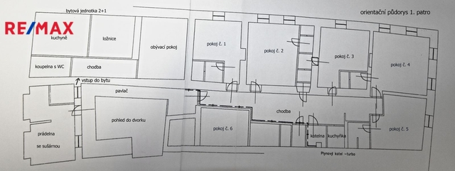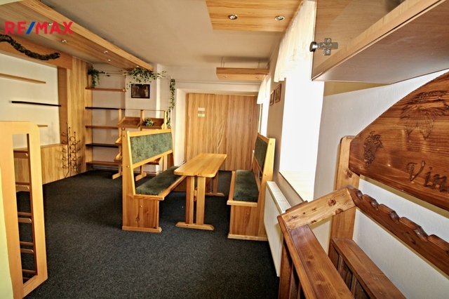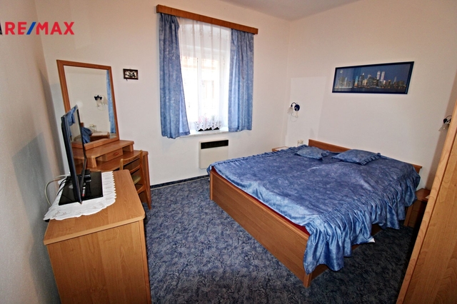 V přízemí se nachází větší prodejna se samostatným vchodem z náměstí 120 m2. V současné době využívaná jako prodejna textilu. Sestává se z prostorné prodejní místnosti, chodby, skladu a sociálního zařízení. Dále se v přízemí se vstupem z boční Linecké ulice nachází další komerční prostory 61 m2, které byly využívány jako vinotéka. Sestávají se ze vstupní přepažené místnosti, kuchyňky, skladu, kanceláře a sociálního zařízení. Vchodem z boční ulice se také vchází průchodem do menšího uzavřeného dvorku odkud je po kamenném venkovním schodišti umožněn přístup do patra na pavlač 15,3 m2, ze které se vchází do místností, sloužících jako prádelna se sušárnou 19,3 m2 a do bytové jednotky o dispozici 2+1, 60 m2. Dále na pavlač navazuje chodba 30,2 m2 odkud se samostatně vstupuje do šesti pokojů, sloužících k soukromému ubytování. Každý pokoj má vlastní sociální zařízení včetně společné kuchyňky 2,7 m2 s úklidovou komorou 0,95 m2 a skladem 1,26 m2. Rozměry samostatných pokojů se sociálním zařízením jsou 21 m2, 29,5 m2, 24 m2, 22,5 m2, 22,7 m2 a 17 m2. V 1. patře je místnost 3 m2 pro umístění plynového kotle. Recepce sloužící k ubytování se nachází v přízemí v průchodu. Z Linecké ulice se také vchází do samostatné místnosti 11,7 m2, kterou lze využít jako menší kancelář či sklad.