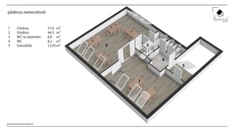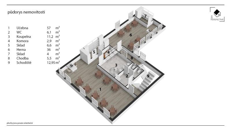 První slouží jako učebna, vhodná i pro kancelář, cvičení či relaxační aktivity. Druhá část je ideální pro semináře, školení či workshopy, s přístupem k samostatným toaletám.