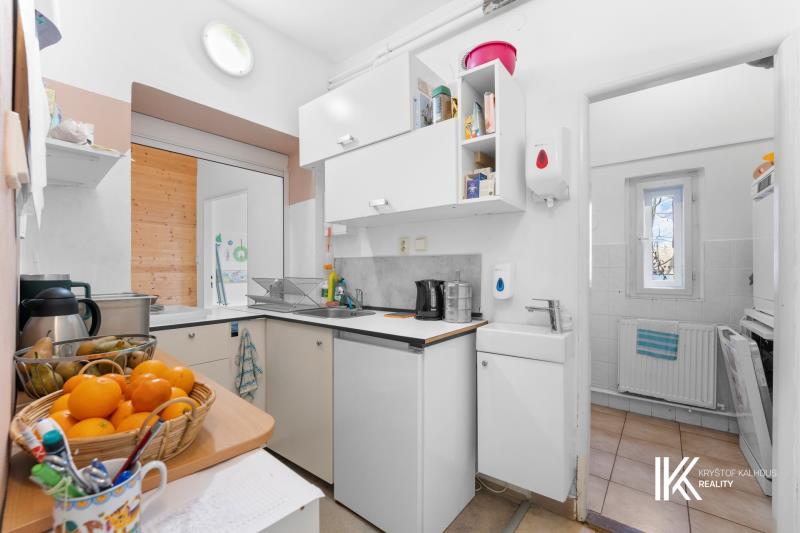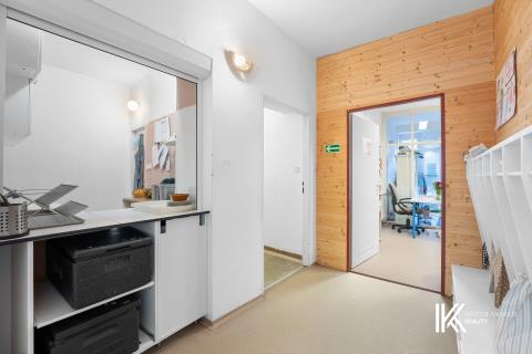 V prvním podlaží se nachází prosvětlená jídelna s výdejním okénkem, kterou lze upravit na společenské zázemí. Kuchyň je rozdělena na dvě části – výdejní prostor a hlavní kuchyňský kout s dostatkem úložného prostoru. Kancelář má samostatný vstup s halou a možností umístění úložných skříní.