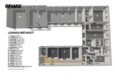 několik samostatných kanceláří, sociální zázemí, sprchy a kuchyňka, skladové prostory, dílny, garáže, kryté parkovací stání