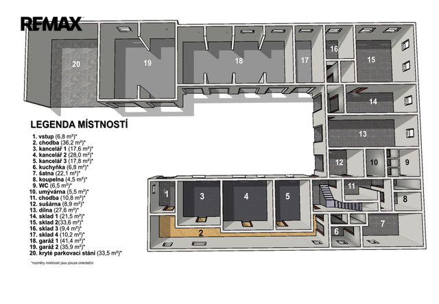 Objekt nabízí praktické dispoziční řešení s dostatkem místností, zázemím pro zaměstnance i parkováním.