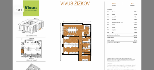 Aktuálně nabízím k prodeji nebytovou jednotku o celkové ploše 101,9 m², situovanou v 1. podzemním podlaží (přízemí při pohledu z ulice) moderního rezidenčního projektu Vivus Žižkov. Předpokládané dokončení projektu a předání jednotky je duben 2026. Prodej formou přenechání práva koupit, na základě SOSBK. Nebytová jednotka je navržena jako funkční administrativní celek a zahrnuje: - 2 samostatné kanceláře - 1 zasedací místnost s kuchyňkou - koupelnu a WC - samostatné WC - sklad - 2 komory Dispoziční řešení umožňuje efektivní provoz menší firmy, advokátní kanceláře, architektonického studia, účetní firmy či jiných služeb. Prostor je vhodný jak pro vlastní podnikání, tak jako investice k následnému pronájmu. Projekt Vivus klade důraz na moderní architekturu, kvalitní stavební provedení a dlouhodobou hodnotu nemovitosti. Samozřejmostí jsou nové technologie odpovídající současným standardům výstavby. Jednotka je součástí nově vznikající rezidenční lokality s postupným rozvojem okolní infrastruktury a služeb. Městská část Žižkov patří mezi dlouhodobě nejvyhledávanější lokality širšího centra Prahy. Nabízí kombinaci rezidenční zástavby, administrativních prostor a kompletní občanské vybavenosti. V okolí se nachází množství restaurací, kaváren, obchodů i sportovišť. Výborná je také dopravní dostupnost do centra města – MHD v docházkové vzdálenosti zajišťuje rychlé spojení do všech částí Prahy. Žižkov je dynamicky se rozvíjející čtvrť s vysokou poptávkou po komerčních prostorách, což z nemovitosti činí zajímavou investiční příležitost. Kupní cena: 10.560.000 Kč Provize RK: 2 % z kupní ceny + DPH V případě zájmu Vám rád zašlu bližší informace k projektu.