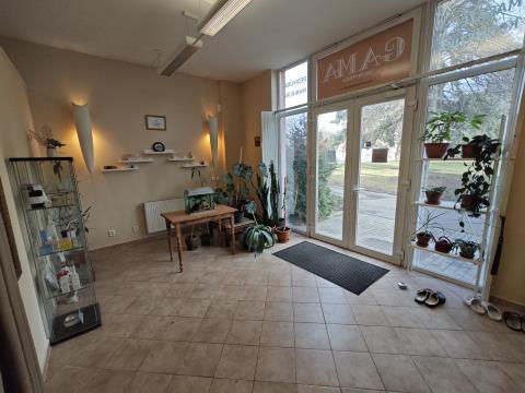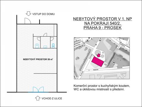 Nebytový prostor o celkové výměře 59m2 s přímým vstupem z ulice se nachází v přízemí bytového domu na sídlišti Prosek. Vstupní část tvoří malá recepce, hlavní místnost, kuchyňka a příslušenství (WC, umyvadlo, úklidová komora) a dále je zde umístěn zadní vchod do společných částí bytového domu. Velkoplošné dvoukřídlé plastové vchodové dveře s dvojskly, bezpečnostní mříží uzamykatelnou zevnitř a horním a bočním zaskleným prostorem vhodným na umístění reklamního poutače. Podlahy - dlažba, vytápění radiátory s centrálním zdrojem tepla. Prostor je bezbariérový s vysokými stropy a v současnosti je provozován jako masážní salón a kosmetika( dříve kavárna), ale nabízí se zde možnost dalšího komerčního využití, jako ordinace( dvě zastávky od nemocnice Bulovka), kancelář apod., popřípadě je zde možná i přestavba na bytovou jednotku se souhlasem SVJ, který zajistíme. Místo je výborně přístupné, autobusová zastávka přímo u domu, metro Střížkov v docházkové vzdálenosti. Provizi nehradíte, Doporučujeme