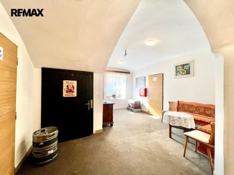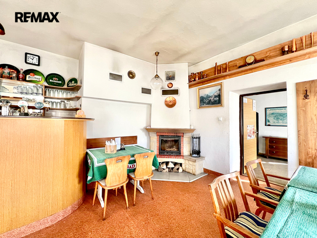Restaurace s vybavenou kuchyní, 20 míst k sezení, bar, WC. Velký salonek 50 míst, krb, kulečník, šipky - možnost pořádání akcí, svatby, rodinné oslavy atd.