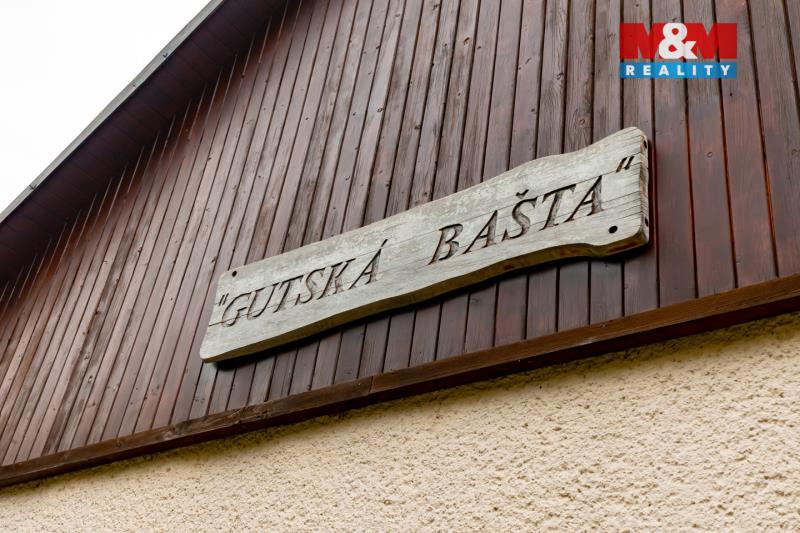 Exkluzivně Vám nabízíme k prodeji fungující restauraci a penzion v klidné části obce Guty, oblíbené beskydské lokalitě. Tato cihlová stavba o 2 nadzemních podlaží je známá jako Gutská Bašta, vyhledávaná pro stravování, ubytovaní, svatby, oslavy apod. disponuje rozlehlými pozemky o celkové výměře 3 167 m² a sklepem. Na zahrádce je vybudováno posezení s krbem, dětské hřiště a dvě studny. V interiéru naleznete restauraci pro 35 osob, salónek pro 15 osob, sál s pódiem a krbem pro 45-60 osob a ve druhém podlaží 5 dvoulůžkových pokojů s vlastními koupelnami. Veřejné toalety pánské, dámské i pro invalidy jsou nedílnou součástí, stejně jako zázemí pro zaměstnance, sklady a parking přímo u budovy. Elektroinstalace v mědi, voda z veřejné sítě, odpad řešen septikem. Stav nemovitosti je velmi dobrý, ideální pro převzetí rozběhlého provozu či úpravu dle vlastních podnikatelských představ. K dispozici dle domluvy, pro více informací neváhejte kontaktovat makléře!